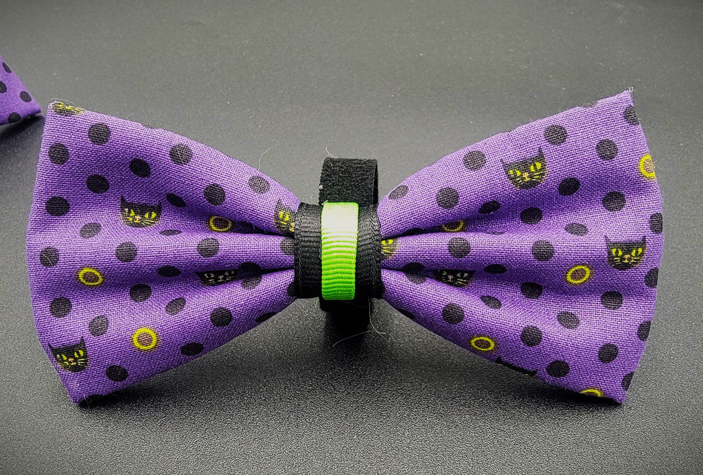 Our bow ties have adjustable Velcro on the back to easily fit around collars and harnesses.