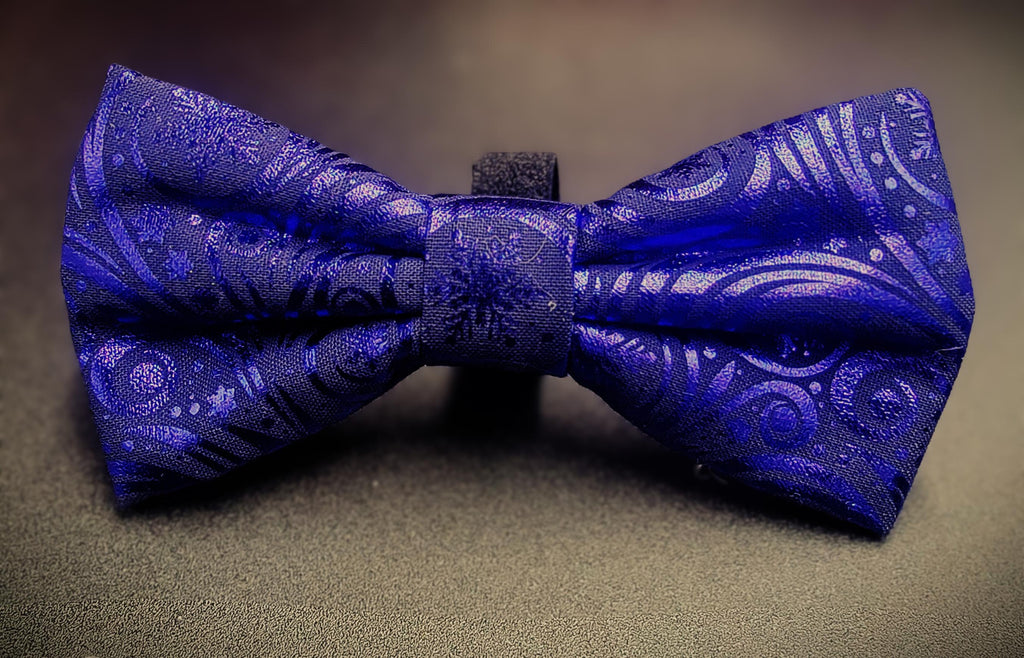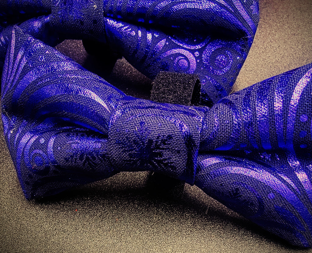 Our standard size dog bow ties measure 5" and our mini size fabric pet bow ties measure 4" and have adjustable Velcro on the back to easily fit around pet collars and harnesses.
