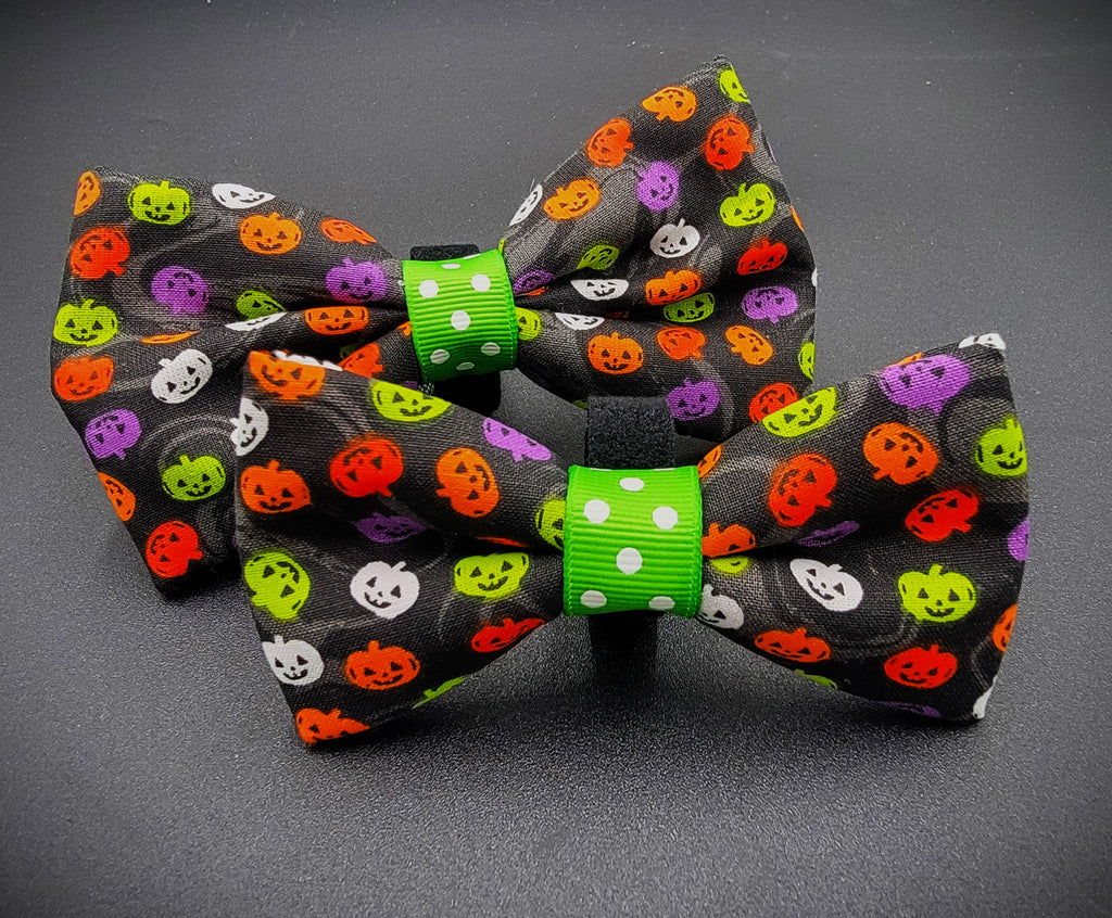 Our bow ties have adjustable Velcro on the back to easily fit around collars and harnesses.