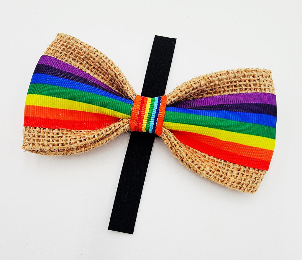 Our standard size burlap dog bow ties measure 5" and have adjustable Velcro on the back to easily fit around pet collars and harnesses.