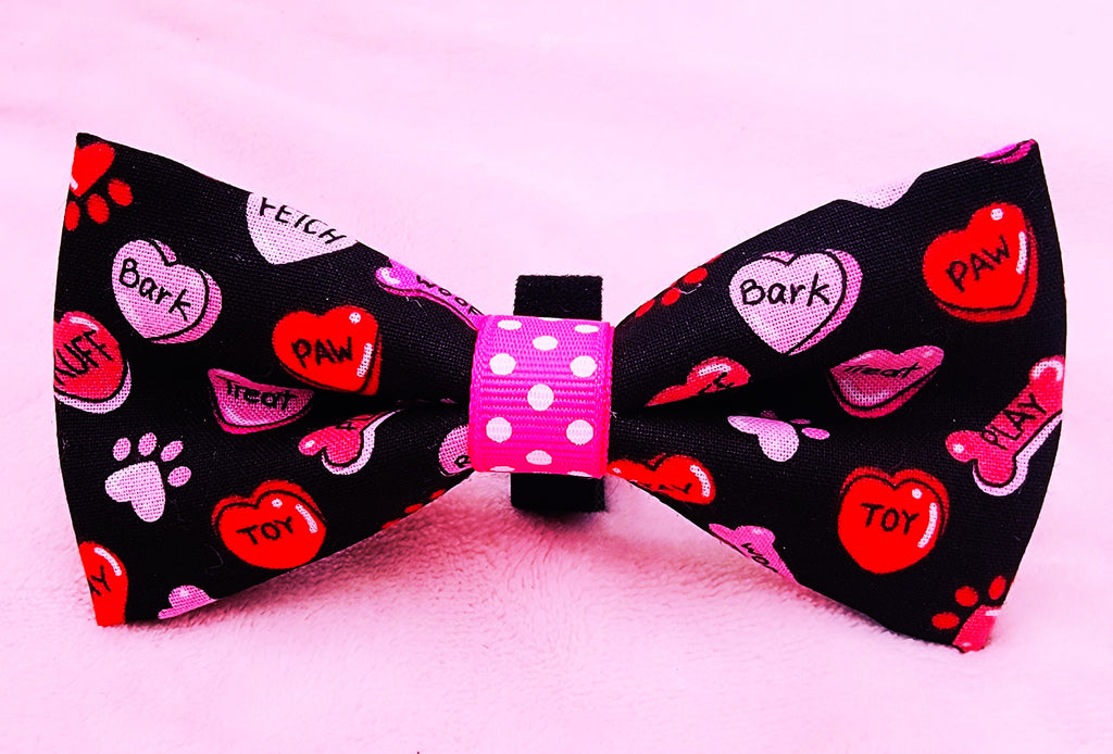 Our standard size dog bow ties measure 5" and our mini size fabric pet bow ties measure 4" and have adjustable Velcro on the back to easily fit around pet collars and harnesses.